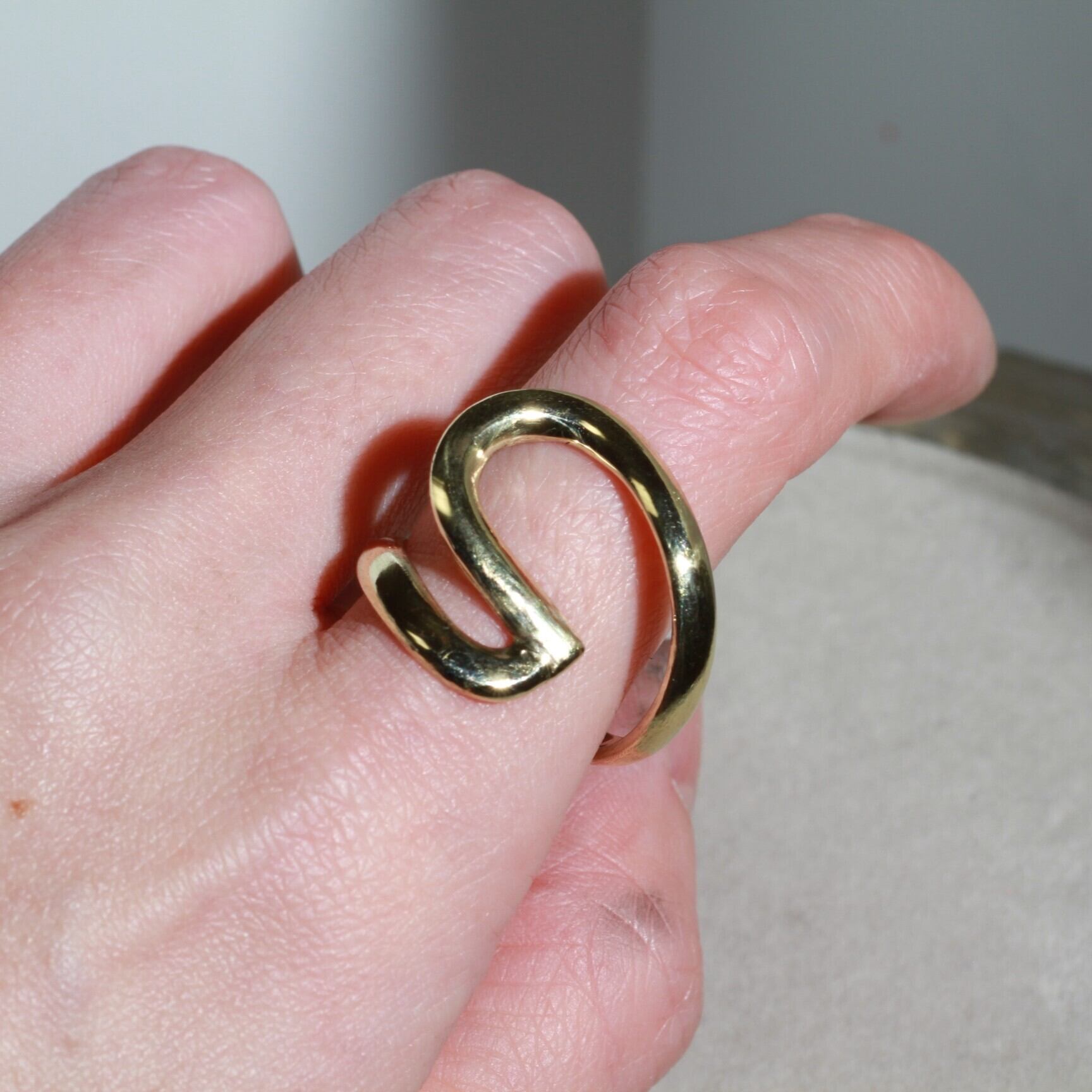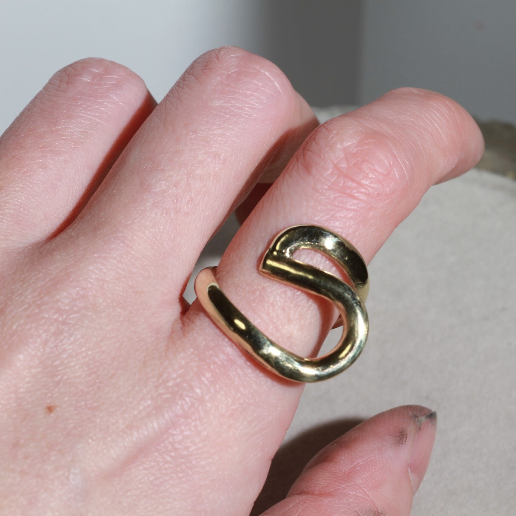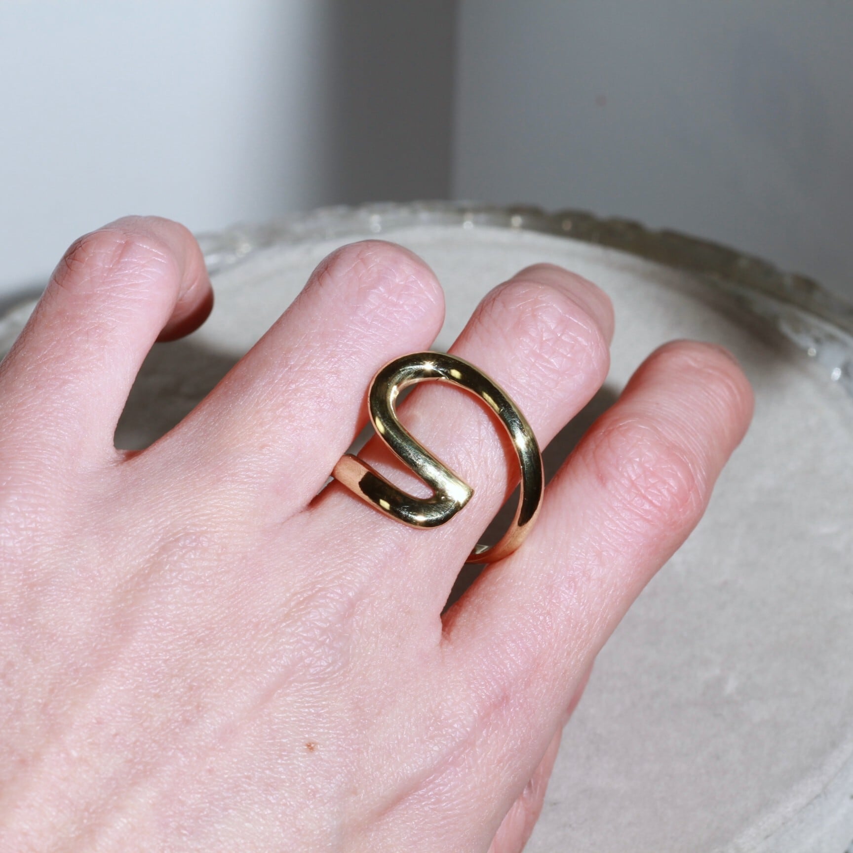 一筆書きのように、手を動かしながら自由に線を描き、曲げ、重ね―― そうして生まれたのは、流れるような曲線と幾何学的なエッジが共存するアートな指輪。