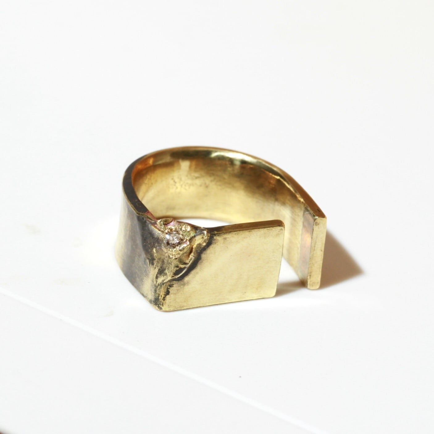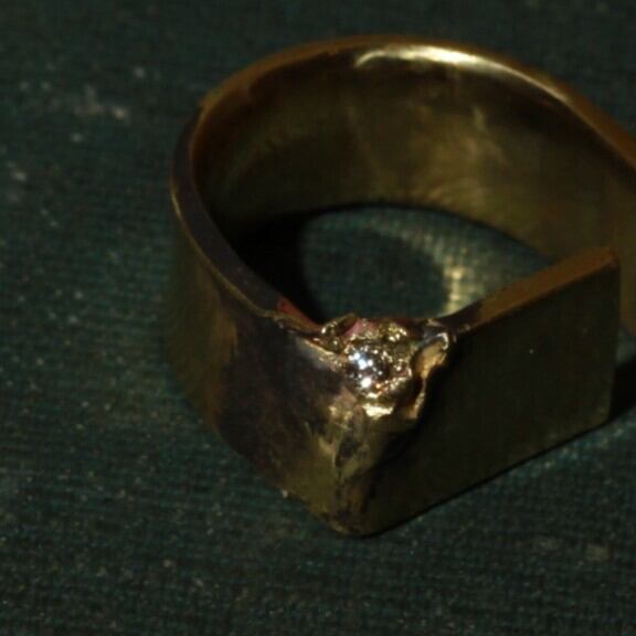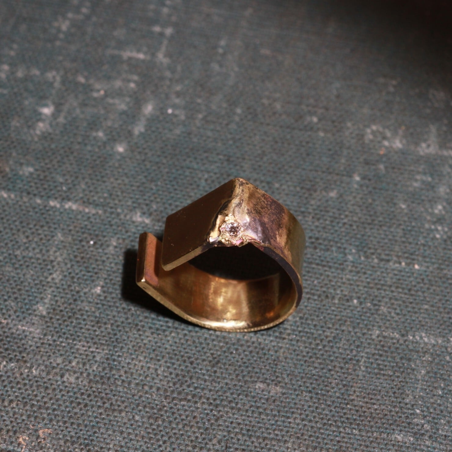真鍮の幅広リングに、天然ダイヤモンドを一粒添えた一点もの。