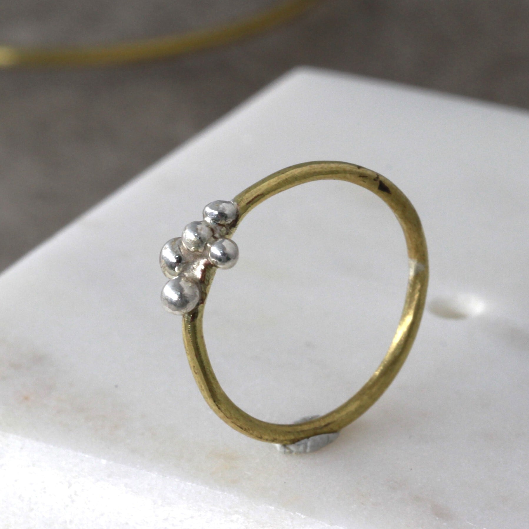 まっすぐのシンプルな真鍮の腕にワンポイントで純銀の粒をちりばめたリング